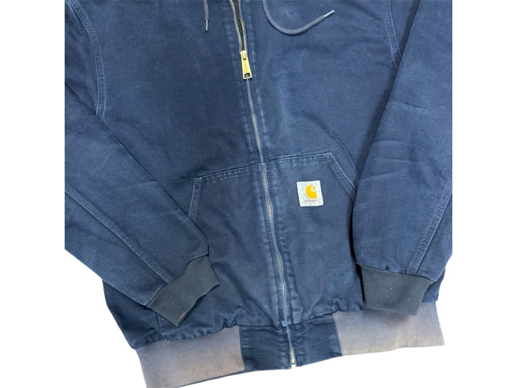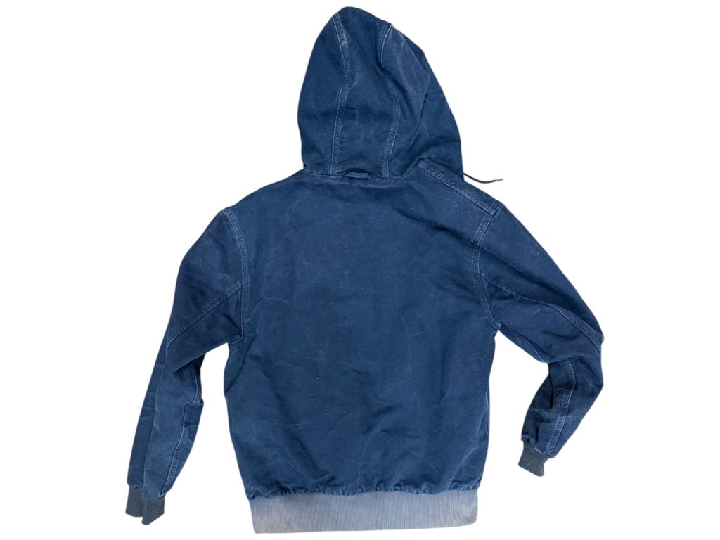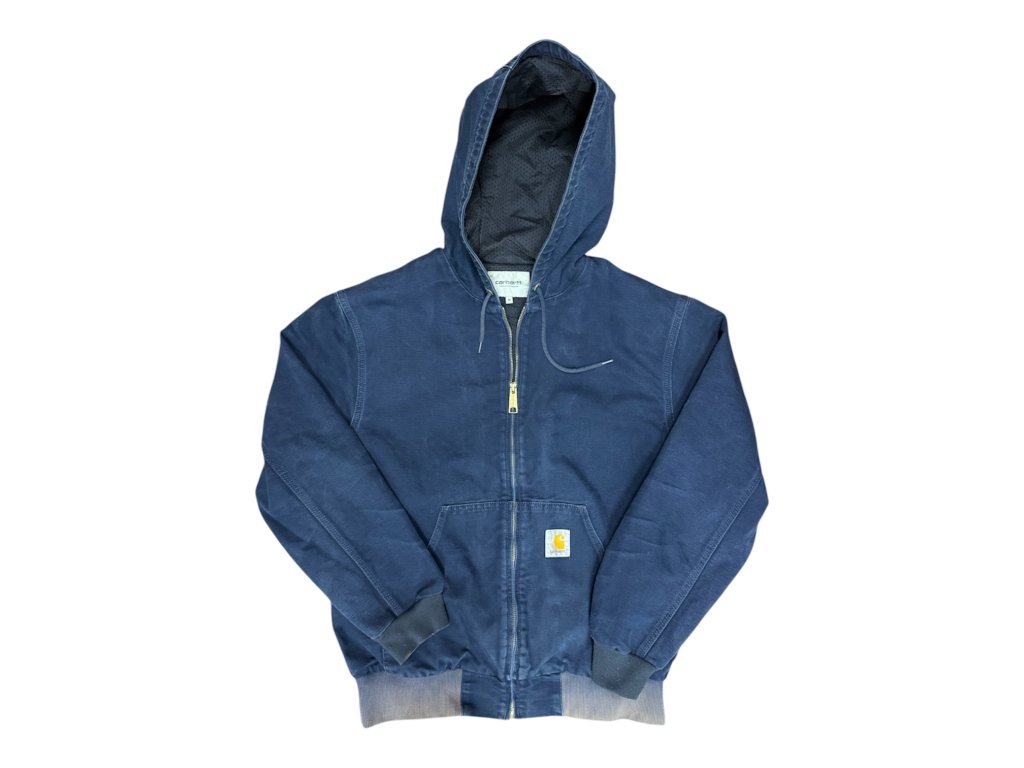 Carhartt WIP Active Jacket in deep navy. Durable cotton duck shell with lightweight mesh lining, full zip front, hood and ribbed cuffs/hem. Clean early–mid 2000s WIP era piece with subtle fading — classic workwear shape, easy everyday jacket.